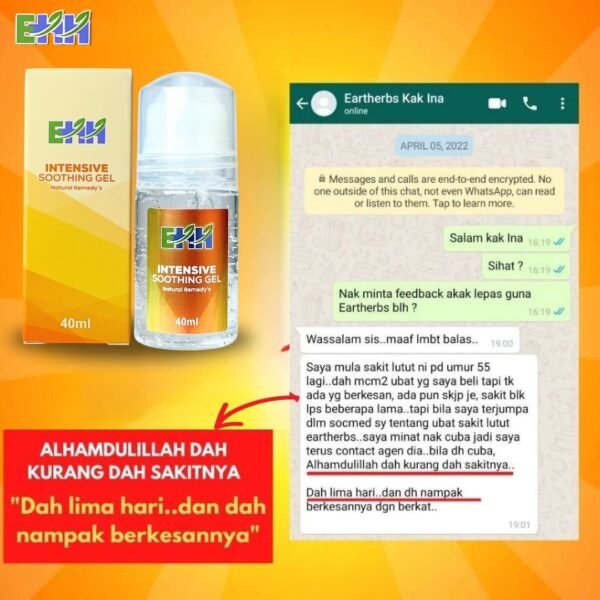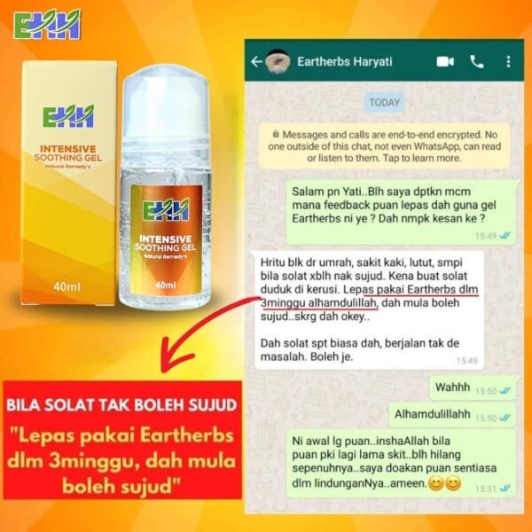“Alhamdulillah sakit lutut dan semakin kurang selepas 5 hari amalkan Gel EARTHHERBS ni..”